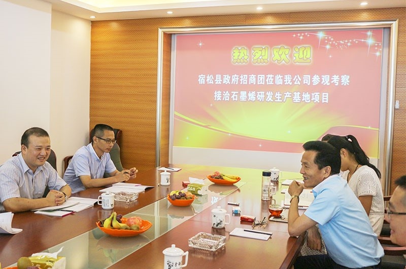 7月28日下午,由副县长黄钊、招商局局长张天生、驻外招商组组长唐斌一行四人组成的安徽省安庆市宿松县招商考察团,专程来到安徽省博超控股集团考察、调研石墨烯研发生产基地建设项目。集团董事长刘维玉、总经理汪磊接待招商考察团一行并座谈。