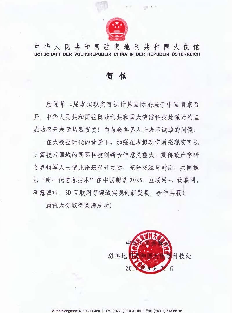 2017年9月28日,第二届虚拟现实可视计算国际论坛南京会场将在江苏省会南京正式召开。中国驻奥地利大使馆、国务院侨务办公室经济科技司等政府机构纷纷发来贺信,表达了对于召开本次大会的祝贺及大会意义的肯定。